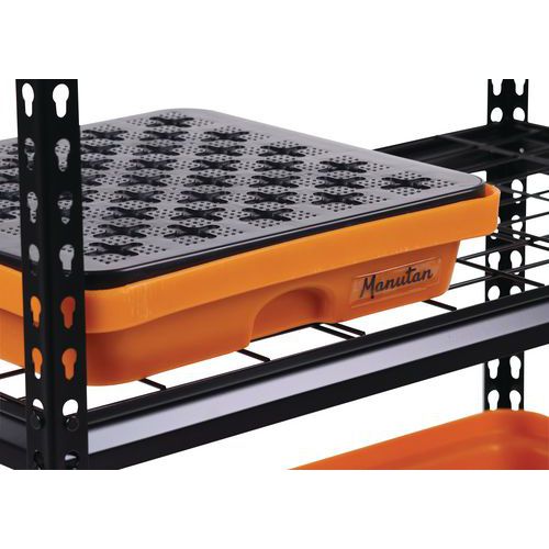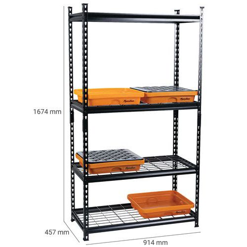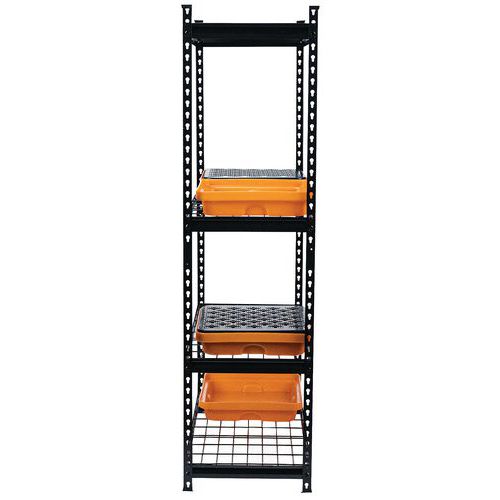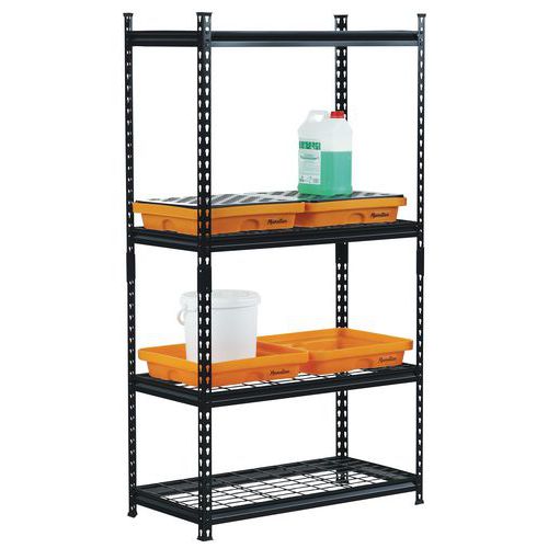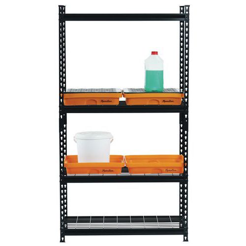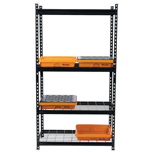 | Intitulé du produit | Rayonnage de rétention avec bacs, Charge maxi par tablette: 250 kg, Hauteur: 1674 mm, Nb de tablettes: 4 |