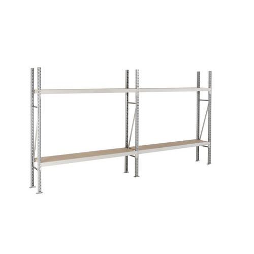 Rayonnage d'entrepôt robuste en acier galvanisé avec tablette agglomérée. Plateau bois, idéal pour les charges non conditionnées, en vrac et les petits colis. Montage aisé sans outils, extension simple à réaliser avec l'ajout d'éléments suivants. Finition résistante aux chocs et rayures avec échelles acier galva et lisses peinture époxy.