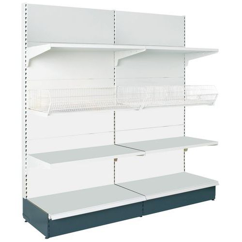 Kit rayonnage de magasin, acier blanc. Système emboîtable, sans vis ni boulons. Pieds équipés de vérin, réglables en hauteur. Rayonnage de grande stabilité avec socle acier. Au choix 2 natures de cloison : lisses ou perforées. Modèle perforé : perforation ronde Euro. Rayonnage avec de nombreux accessoires optionnels.