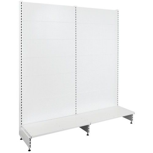 Kit rayonnage de magasin, acier blanc. Système emboîtable, sans vis ni boulons. Pieds équipés de vérin, réglables en hauteur. Rayonnage de grande stabilité avec socle acier. Au choix 2 natures de cloison : lisses ou perforées. Modèle perforé : perforation ronde Euro. Rayonnage avec de nombreux accessoires optionnels.