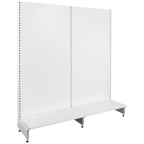 Kit rayonnage de magasin, acier blanc. Système emboîtable, sans vis ni boulons. Pieds équipés de vérin, réglables en hauteur. Rayonnage de grande stabilité avec socle acier. Au choix 2 natures de cloison : lisses ou perforées. Modèle perforé : perforation ronde Euro. Rayonnage avec de nombreux accessoires optionnels.
