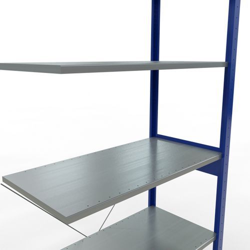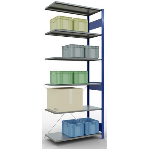 Système de rayonnage robuste et très complet avec belle finition peinte époxy, gris ou bleu. Tablettes pleines acier tôlé pouvant supporter des marchandises de multiples dimensions. Étagère industrielle facile et rapide à monter par emboîtement, sans outillage particulier. Extension de rayonnage aisée avec l'adjonction de 1 ou plusieurs éléments suivants.