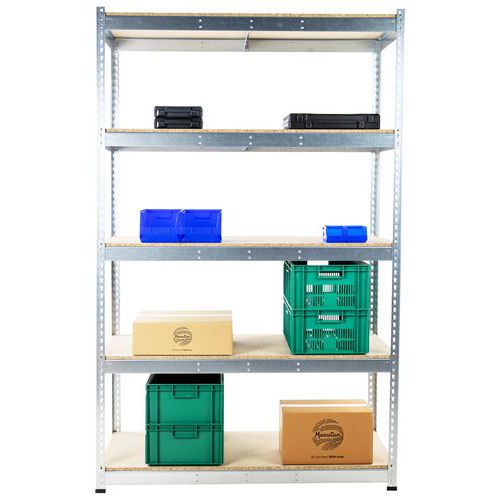Rayonnage industriel simple et ultra-robuste pour stockage des marchandises de charge lourde. Tablette pleine bois parfaite pour l'entrepôt des petites pièces en vrac et/ou contenants divers. Finitions résistantes aux chocs et aux environnements divers : zinguée et époxy gris/bleu. Étagère d'entrepôt de montage facile, sans l'aide de techniciens et d'outils spécifiques. Modulable, pour adapter la hauteur des niveaux à vos besoins.
