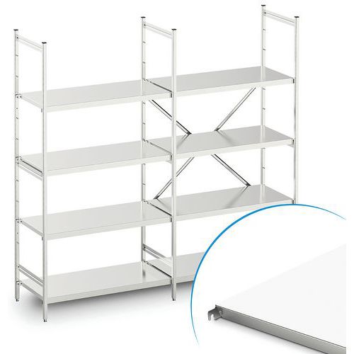 Rayonnage médical acier inoxydable à tablette pleine inox. Hygiène irréprochable : matériau inox 18/10, qualité 1.4301. Obturation parfaite des montants avec bouchon PVC de terminaison. Modulable : configuration d'angle à 90° par crochet, sans ajout d'échelle. Rayonnage extensible par ajout de module complémentaire, dit « élément suivant ». Montant muni de pied réglable à la main de +/- 25 mm. Rayonnage idéal salles blanches, salles de stérilisation et blocs opératoires !