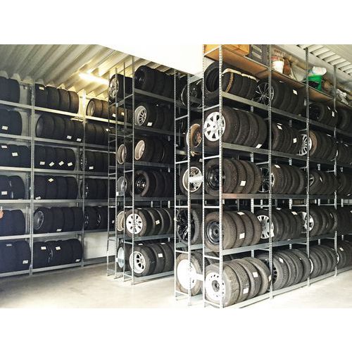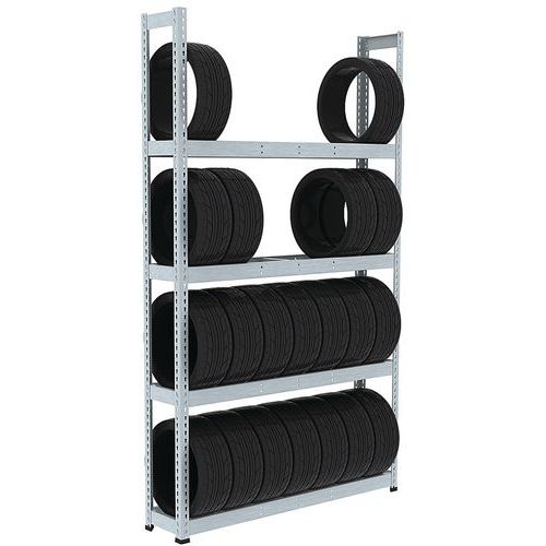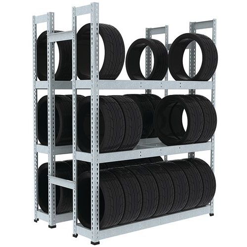 Solide rayonnage métallique pour pneu, simple et double face. Déclinaison 3 finitions : peinture époxy gris ou bleu, ou zinguée. Étagère d'entrepôt de montage aisé, sans l'aide d'outils spécifiques.