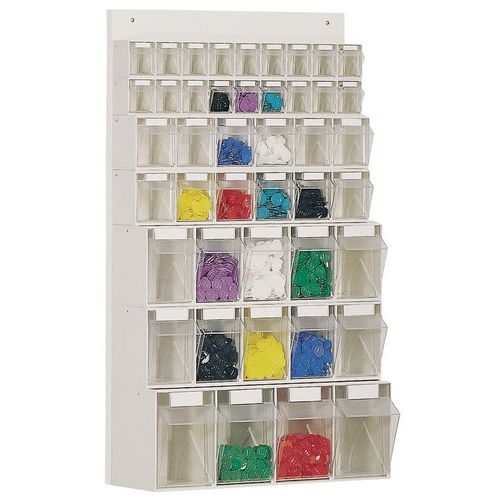 Jeu complet de bacs inclinables à suspendre au mur. Avec 4 rangées de bacs inclinables transparents pour un aperçu clair du contenu.