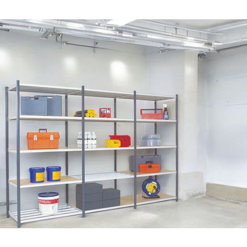 Robuste rayonnage d'entrepôt acier de structure tubulaire. Rayonnage stable sans croisillon pour un double accès (2 faces). Montant avec perforations en T (4x37 mm) non visibles en façade. Finition époxy ou galva : résistance aux chocs, aux rayures et à l'humidité. Pied plastique sous montant : bonne stabilité de l'ensemble et préservation des sols. Tablette tubulaire entièrement soudée, avec 4 connecteurs d'accroche aux extrémités. Convient idéalement aux entrepôts, garages, ateliers.