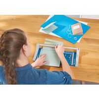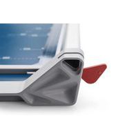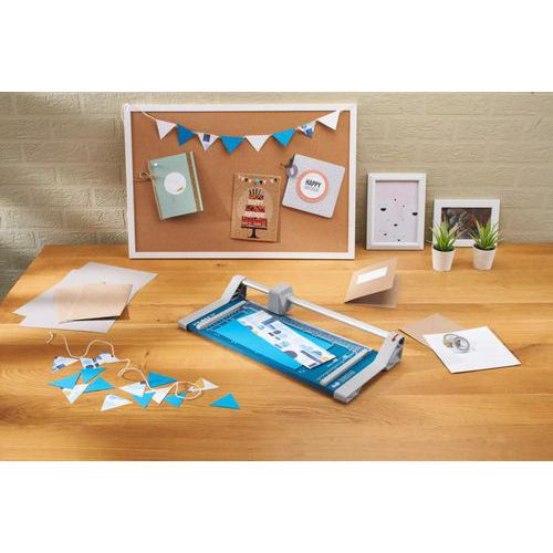 Rogneuse compacte sur table, solide en métal avec pieds antidérapants. Tracés des formats DIN sur la table. Lame circulaire affûtée. Pression automatique au point de coupe. Deux butées latérales millimétrées perpendiculaires. Remplacement aisé de la tête de coupe. Contre-lame. Lame circulaire carrénée.