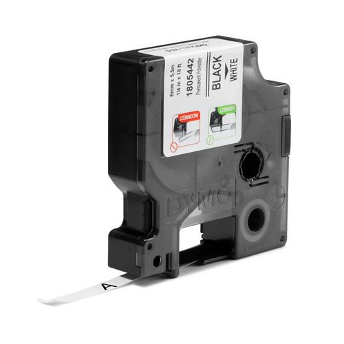 Ruban étiquette Industrielle Rhino en polyester auto-adhésive 6 mm x 5.5 m autocollantes impression en Noir sur fond blanc pour étiqueteuses Rhino et LabelManager. Étiquettes adhésives de qualité industrielle ne risquent pas de se corner ou de se décoller. Grâce à leur dos fendu facile à décoller vous pouvez apposer aisément et rapidement ces étiquettes. Dispose de la technologie d'impression par transfert thermique permet d'éviter que le texte de l'étiquette bave laisse des taches ou s'estompe. Étiquette souple sans mémoire de forme, peut-être facilement enroulée autour de surfaces courbes et rester en place. Les cassettes d'étiquettes continues vous permettent de créer des étiquettes nettes et facilement lisibles de la taille souhaitée. À utiliser avec les étiqueteuses LabelManager et Rhino.