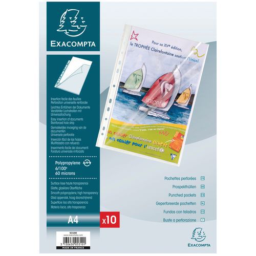 | Intitulé du produit | Sachet de 10 pochettes perforées ouverture haut et côté A4, Coloris: Transparent |