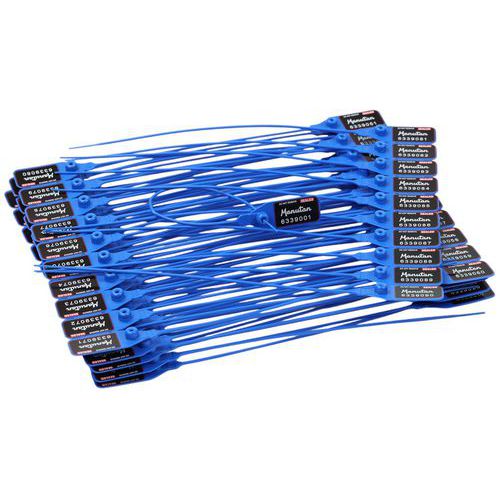 Scellé à identification par numérotation unique. Marquage : chiffrage par série (11, 12, 13, etc.). Scellé avec tige lisse avec mécanisme de fermeture métallique. Fabriqué en UE Garantie client : 10 ans