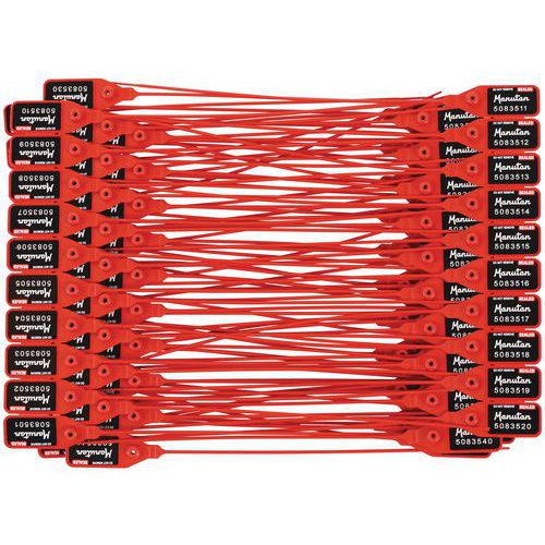 Scellé à identification par numérotation unique. Marquage : chiffrage par série (11, 12, 13, etc.). Scellé avec tige lisse avec mécanisme de fermeture métallique. Fabriqué en UE Garantie client : 10 ans