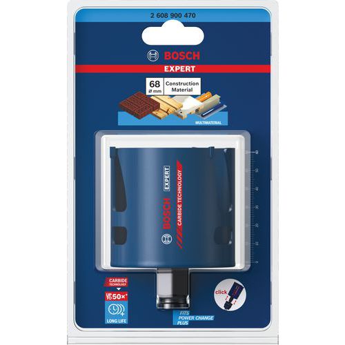 Scie trépan Power Change carbure multiconstruction - Bosch Dure jusqu'à 50 fois plus longtemps qu'une scie trépan HCS dans des matériaux durs Extrême longévité garantie par Bosch Carbide Technology (technologie carbure). À utiliser avec le montage sans clé Bosch Power Change Plus : offrant précision et robustesse. Idéale pour percer des trous jusqu'à 60 mm de profondeur, par exemple pour la pose de gaines destinées aux fils électriques et aux tuyaux d'eau potable et d'eaux usées des plombiers, ou encore pour percer des trous pour des prises, des interrupteurs, des boîtiers de dérivation, un éclairage encastré, des alarmes incendie, des détecteurs de présence ou bien pour les conduits de climatisation ou de soufflage. Idéale pour les électriciens et les plombiers : durable et très polyvalent.