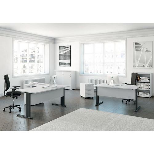 Bureau droit conçu pour le travail informatique, disponible en retour à droite ou retour à gauche. Plateaux en panneaux mélaminés ép. 25 mm, traités anti-reflets et anti-rayures, aux propriétés anti-bactériennes. Plateaux munis de 1 obturateur, diam. 80mm, pour le passage des câbles vers les piétements. Piétements métal assemblés par un voile de fond structurel et équipés d’enjoliveurs amovibles pour le passage des câbles. Idéal pour le home office (télétravail). Qualité E1, densité 650kg/m3. Chants ABS anti-choc 2 mm.
