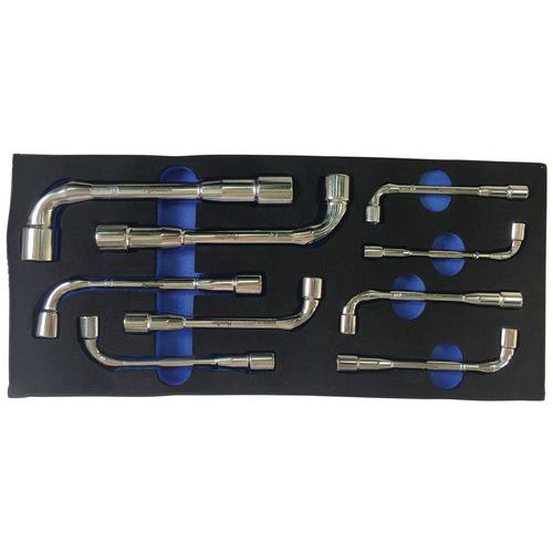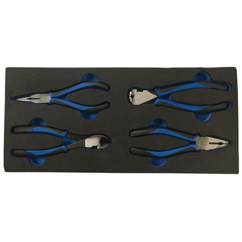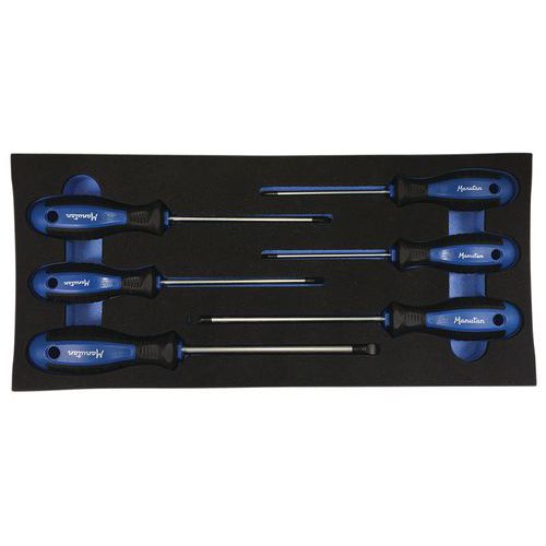 Servante 6 tiroirs livrée avec : Module mousse 2/3 avec 2 jeux de clés mâles Module mousse 1/3 avec 6 tournevis Module mousse 1/3 avec 4 outils de serrage/vissage Module mousse 1/3 avec 20 outils 1/2" Module mousse 1/3 avec 9 clés mixtes à cliquet Module mousse 1/3 avec 9 clés à pipe Module mousse 1/3 avec 4 pinces Module mousse 1/3 avec 1 massette et 1 maillet Module mousse 1/3 avec 3 outils de coupe