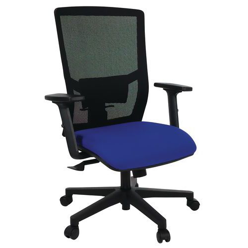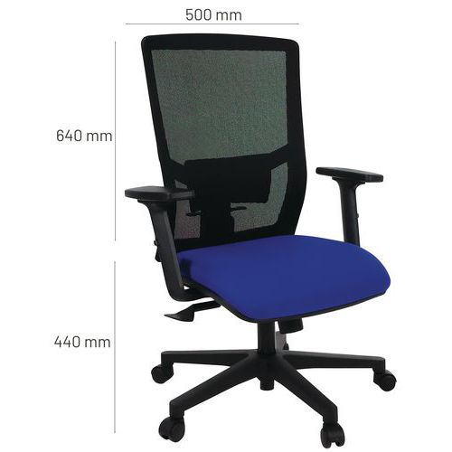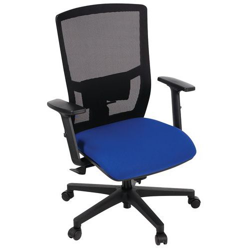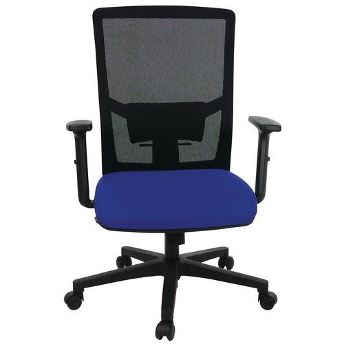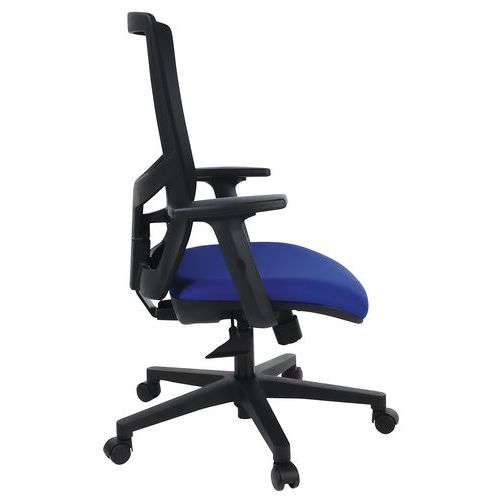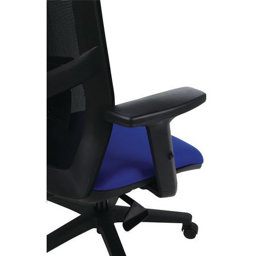 Siège de bureau avec accoudoirs 3D permettant une orientation en hauteur, largeur et profondeur. Dossier anti-transpirant en résille. Assise en tissu confortable. Mécanisme synchrone.