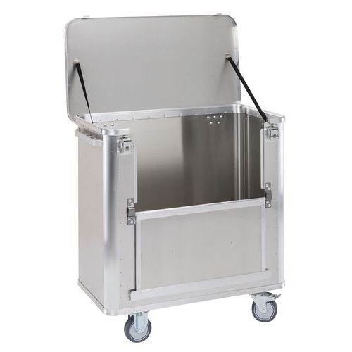 Chariot conteneur en aluminium pour une utilisation universelle. Hygiénique, sans odeur et ne rouille pas. Utilisation facile et ergonomique, même avec une charge maximale. Surface lisse, parois non nervurées permettant un nettoyage facile. Paroi rabattable maintenue en position ouverte grâce à deux aimants. Couvercle à charnières, 2 sangles de maintien et 2 fermetures à levier. Fond incliné avec 2 orifices d’évacuation, les deux orifices d’évacuation munis de soupape d’évacuation, bouchon et chaînette. Fond étanchéifié avec du silicone. Poignées anodisées sur les deux parois frontales.