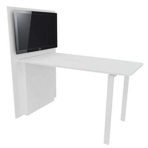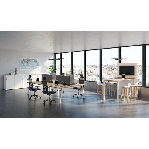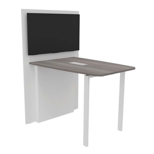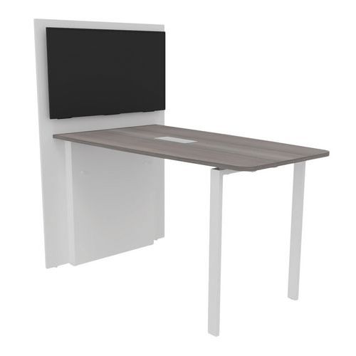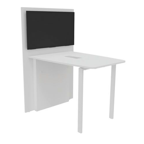 Table équipée d'un top access permettant le passage des cables. Le mur technique est équipé d'inserts pour assurer la fixation du support écran vendu en option, d'une double paroi permettant de loger les arrivées éléctriques, et d'un parement amovible sous le plan de travail pour établir les liaisons filaires. Plateau structure agglomérée finition mélaminée épaisseur 25 mm. Chants ABS anti-choc 2 mm. Piètement métal finition époxy.