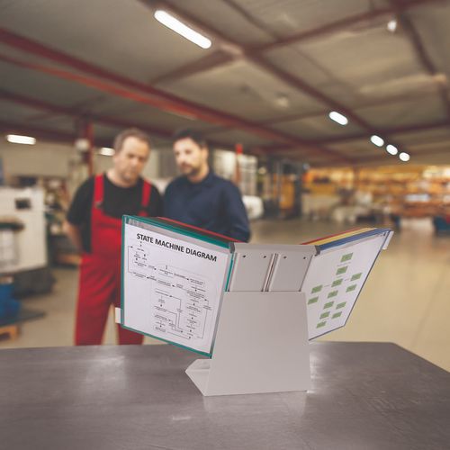 - Support de bureau allant de 10 à 50 pochettes de présentation.
