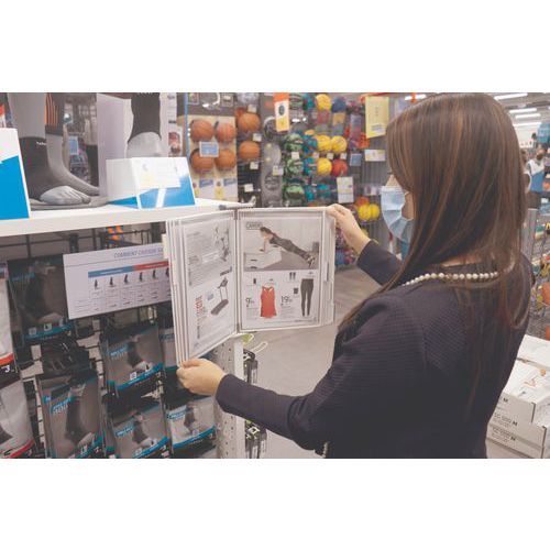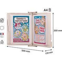 Kit mural antimicrobien à pivot pour mise à disposition hygiénique de documents. Pochette avec produit organique naturel, ions d’argent, stoppant germes et bactéries. Support mural à 4 pluggers pour maintien des pochettes, et 5 cavaliers pour leur indexage. Avec 10 poches pivotantes en PVC Sterifold antimicrobiennes avec pivots métalliques.