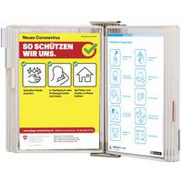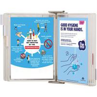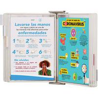 Kit mural antimicrobien à pivot pour mise à disposition hygiénique de documents. Pochette avec produit organique naturel, ions d’argent, stoppant germes et bactéries. Support mural à 4 pluggers pour maintien des pochettes, et 5 cavaliers pour leur indexage. Avec 10 poches pivotantes en PVC Sterifold antimicrobiennes avec pivots métalliques.