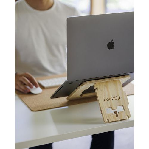 Support ordinateur bois ADASO13 LookUp, améliore naturellement votre posture et votre environnement de travail. Vous aide à réduire vos tensions musculaires au bureau et à la maison. Un design encastrable et léger, facilement transportable. Compatible pour vos PC et MacBook. Utilisable avec et sans clavier déporté. S’adapte instantanément à votre utilisation grâce à sa double inclinaison possible. Fabriqué en bois de pin revalorisé.