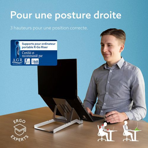 Support d'ordinateur portable R-Go Riser Basic qui permet d'élever facilement l'écran d'un ordinateur portable à hauteur des yeux.