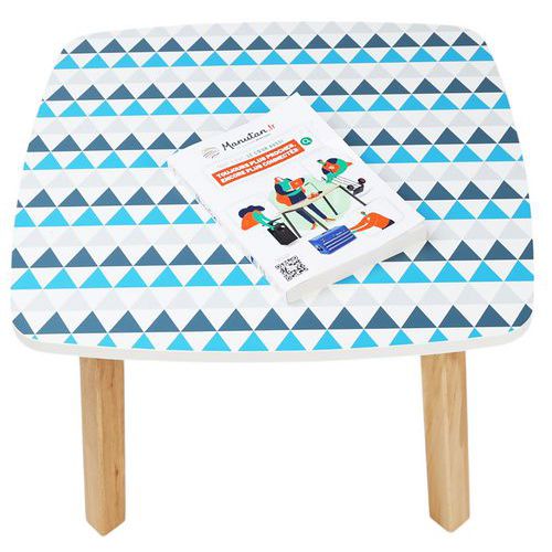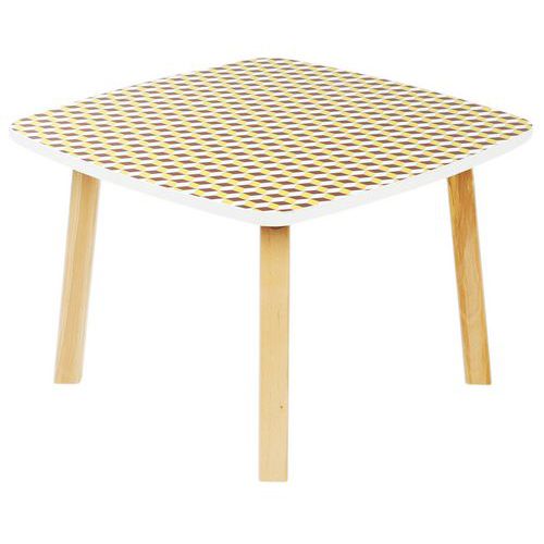 Plateau panneau de particules Surface mélaminé avec décor. Hauteur plateau 40 cm. Plateau épaisseur 20 mm avec chants plaqués. Piètement bois massif vernis section 40 x 40 mm. Livrée prête à monter avec notice (visserie fournie).