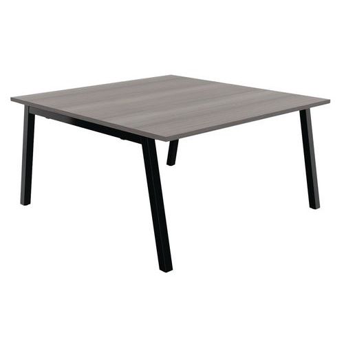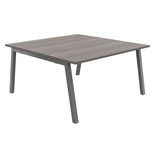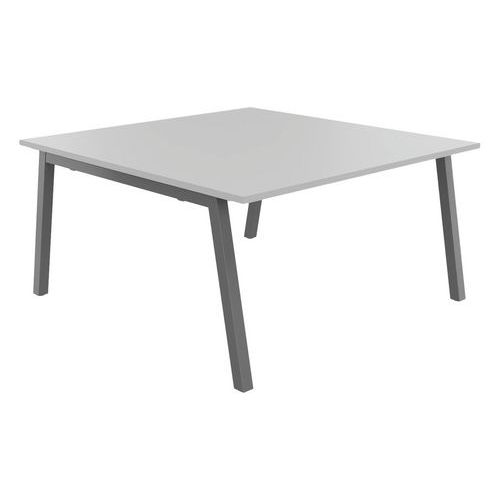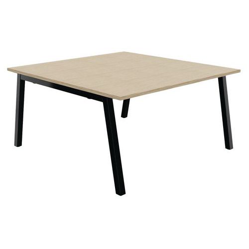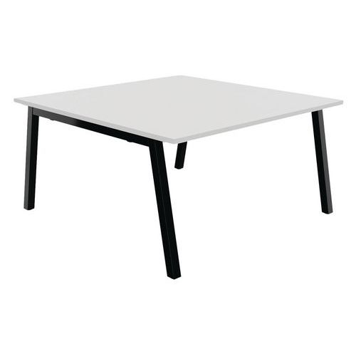 Plateau mélaminé ép. 25 mm Chant ABS antichoc 2 mm Piétement métallique de type arche composé de pieds carrés de section 50 x 50 mm obliques, finition époxy laqué. Vérins de stabilisation pour compenser les défauts de planéité du sol (course de réglage 10 mm)