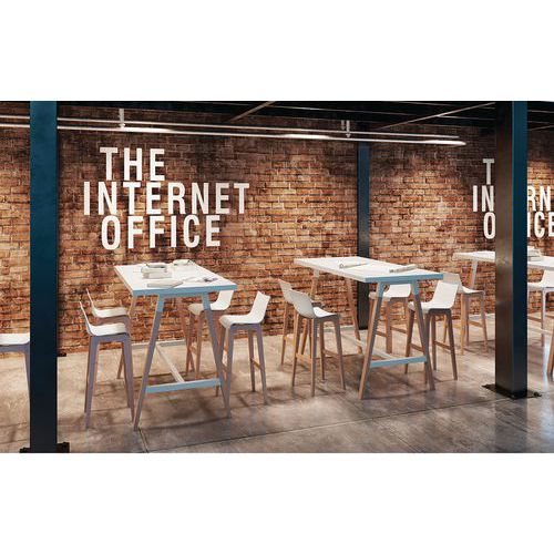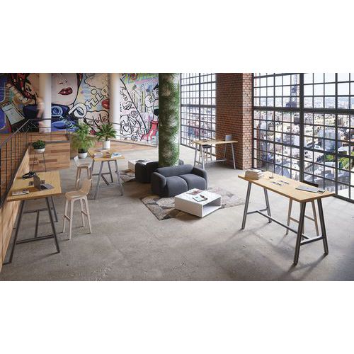 Les tables haute Cohésion répondent aux nouveaux modes de travail debout suscitant l’échange et la collaboration. Les finitions naturelles des plateaux associées aux piétements trapèze métal leur donnent un style industriel. Plateaux en panneaux alvéolaire ép. 38 mm, traités anti-reflets et anti-rayures, aux propriétés anti-bactériennes. Piétements métal arche «A» assemblés par poutre structurelle. Chants ABS anti-choc 2 mm.