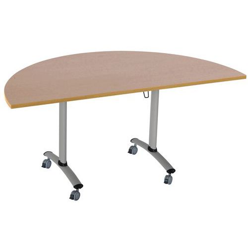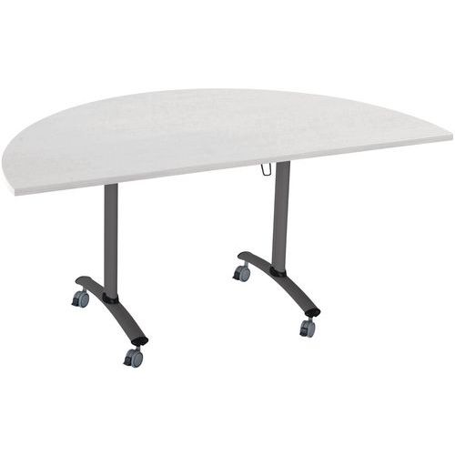 Table de réunion demi lune pliante Axe avec plateau pivotant permettant un gain de place pour le rangement. Verrouillage automatique du plateau en position travail (horizontal) et position verticale (stockage) . Système de liaison rapide entre les plateaux par vis molette. Equipée de 4 roulettes Ø 75 mm avec frein.Table de réunion demi lune pliante Axe avec plateau pivotant permettant un gain de place pour le rangement. Verrouillage automatique du plateau en position travail (horizontal) et position verticale (stockage) . Système de liaison rapide entre les plateaux par vis molette. Equipée de 4 roulettes Ø 75 mm avec frein. Chants ABS épaisseur 2 mm. Piètement métal laqué époxy. Fabriquée en France. Livrée pieds démontés.