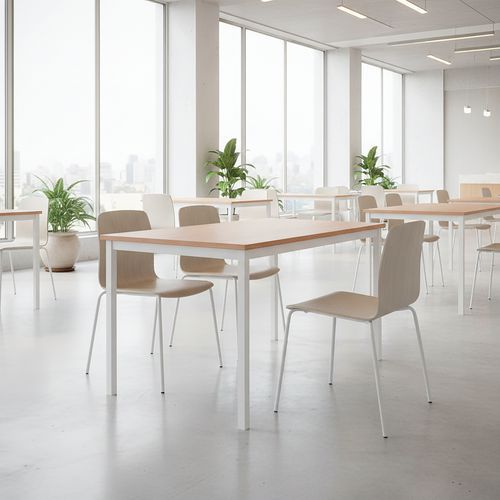 - Table polyvalente avec plateau mélaminé et piètements en métal.