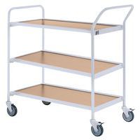 Table roulante avec structure grise, 3 plateaux avec poignée de conduite et arceau tubulaire. Rebords tubulaires de 22 mm et plateau épaisseur de 12 mm. Charge maximale par plateau est de 100 kg. Equipé de 4 roulettes pivotantes dont 2 avec freins.