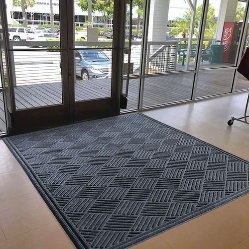 Robuste tapis d'entrée à design breveté «Aqua Dam» avec 4 bordures en tapis renforcé recouvertes de textile agissant comme un bac de rétention pouvant contenir jusque 4 litres d'eau par mètre carré. La surface en textile moulé par injection sur un design en pointe de diamant strié breveté non-directionnel à double effet pour gratter et essuyer la saleté. La semelle en caoutchouc robuste fournit une résistance maximale. Les picots sous la semelle minimisent les mouvements du tapis sur toutes les surface et le surélèvent pour permettre aux sols humides de sécher, même en dessous du tapis.