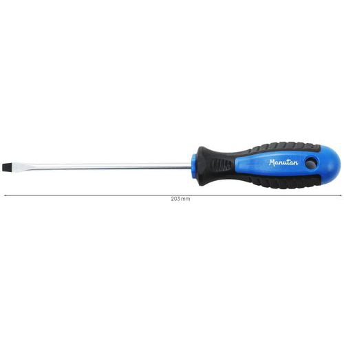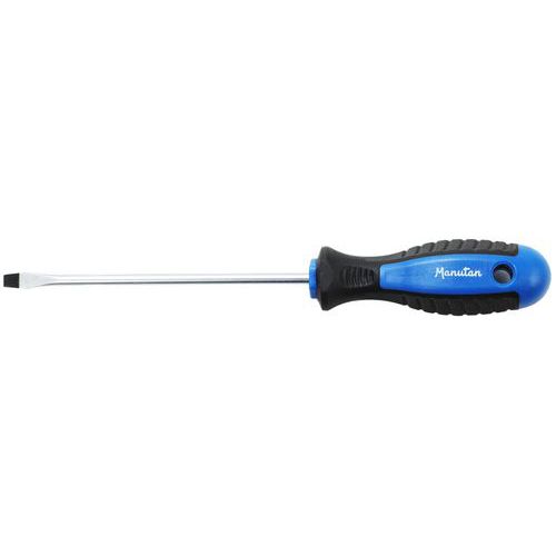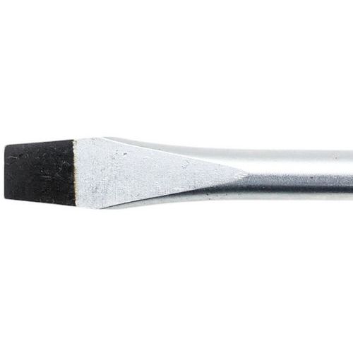 Tournevis de mécanicien pour vis Fente. Manche ergonomique bi-matière offrant confort et bonne prise en main. Extrémité du manche arrondie adaptée à la paume de la main. Lame ronde en acier chrome vanadium avec traitement anti-corrosion très robuste et empreinte traitée brunie pour un meilleur rendu en termes de flexion et de torsion. Garantie client : 10 ans