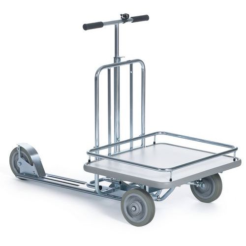 Trottinette/chariot de fabrication suédoise, avec plateforme et moyeux à roulement à billes de précision et souples, une direction stable et un rayon de braquage compact.