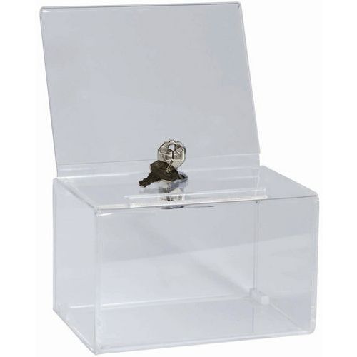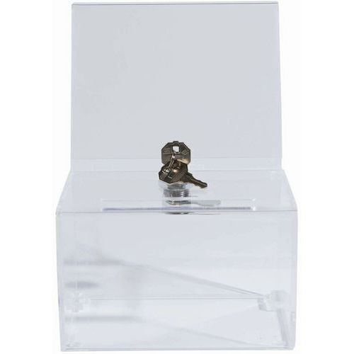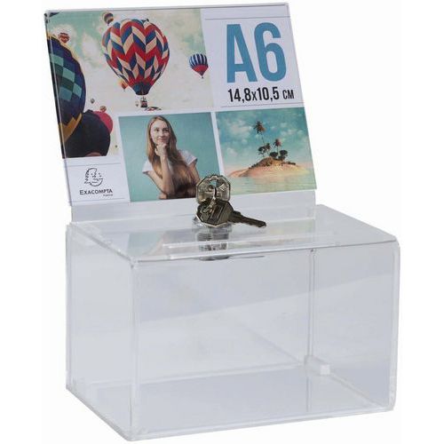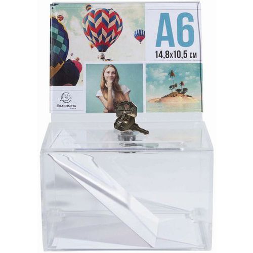 | Intitulé du produit | Urne avec affichette fermant à clé A6, Matériau: Acrylique, Capacité: 0.375 L, Largeur: 140 mm |