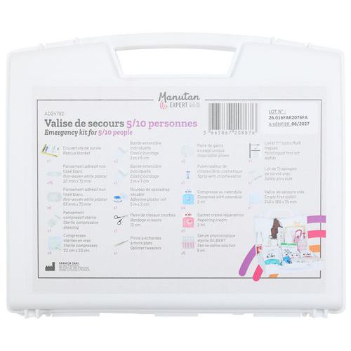 | Intitulé du produit | Valise 1er secours multirisques universelle 5/10 pers, Coloris: Blanc, Largeur: 205 mm, Longueurs: 240 mm |
