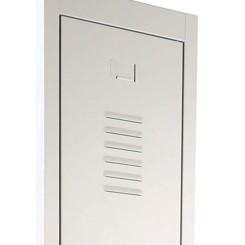 Vestiaire d'entrepôt robuste spécial industrie propre, livré entièrement à plat, démonté. Construction métal durable avec finition peinte revêtement poudre électrostatique. Porte renforcée avec charnières invisibles et anti-bruit avec tampon plastique. Porte à double persienne pour circulation d'air et porte-étiquette estampé. Vestiaire confortable d'utilisation avec large ouverture de porte à 115°.