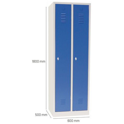 Vestiaire acier robuste à portes renforcées. Ouverture optimale à 180° et charnières invisibles. Hygiénique avec une aération haute et basse des portes. Perforations pour accroche murale, porte-étiquette embouti. Tôle épaisseur structure : 7/10e Garantie client : 10 ans