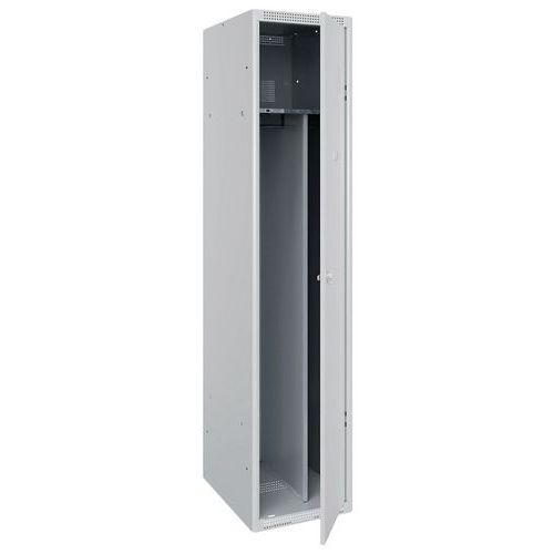 Vestiaire industrie salissante rigide, et sur socle. Profilage système Seamline® renforçant la résistance des montants et des portes. Porte indégondable ouvrant à 120°, avec porte-étiquette, fermeture à moraillon. Séparation verticale fixe 2/3 – 1/3. Tablette intérieure avec tube et crochets.Vestiaire industrie salissante rigide, et sur socle. Profilage système Seamline® renforçant la résistance des montants et des portes. Porte indégondable ouvrant à 120°, avec porte-étiquette, fermeture à moraillon. Séparation verticale fixe 2/3 – 1/3. Tablette intérieure avec tube et crochets. Aérations haute et basse. Structure garantissant rigidité et fiabilité. Procédé de profilage agrafage Seamline®, équivalent à une tôle ép. 10/10ème pliée. Porte avec fermeture à moraillon porte-cadenas (fermeture 1 point). Perforations hautes et basses assurant une aération en conformité avec la norme NF D65-760-2 (février 2007). Séparation verticale fixe 2/3 – 1/3 en tôle galvanisée. Partie gauche larg. 245 mm – partie droite larg. 155 mm. Tablette intérieure en tôle galvanisée, avec tube Ø 14 mm, équipé de 2 crochets plastiques se clipsant sur les patères. Espace utile entre le dessus et la tablette (300 mm) permettant le rangement de casques de chantier ou autres. Livré monté. En option : pieds hauteur 100 mm en polypropylène, avec vérin de mise à niveau (course 20 mm).