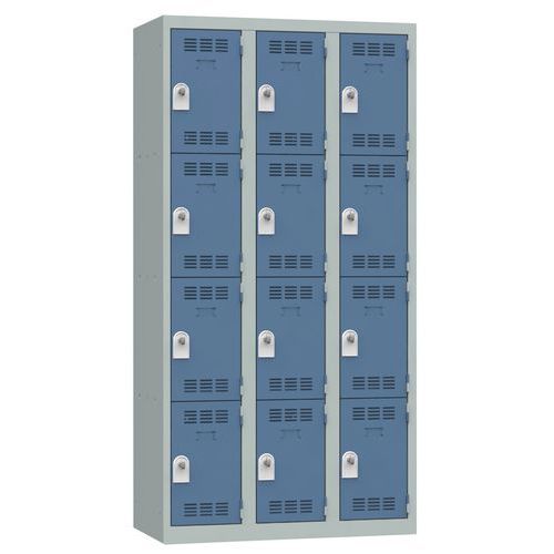 Vestiaire multicases 1 à 4 colonnes avec cases superposées par colonne. De type monobloc, il est soudé en usine pour plus de robustesse et de rigidité. Économique et fonctionnel, grâce à ses larges cases. Permet de ranger différents types d'équipements ou objets. Convient pour les écoles, centres sportifs, hôpitaux, entreprises, secteur tertiaire comme industriel, etc