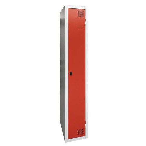 Vestiaire séchant à air chaud pulsé, de grande robustesse, avec case et penderie. Corps et porte en tôle électrozinguée, avec oméga de renfort sur toute la hauteur. Confortable d'utilisation avec un système de charnières offrant une ouverture à 180°. Hygiénique avec une double aération en façade, en partie haute et basse du vestiaire. Belle finition peinture époxy laquée, déclinée en une large palette de coloris attrayants. 2 fermetures au choix : serrure à clé ou moraillon porte-cadenas. Vestiaire avec porte étiquette. Produit fabriqué en France.