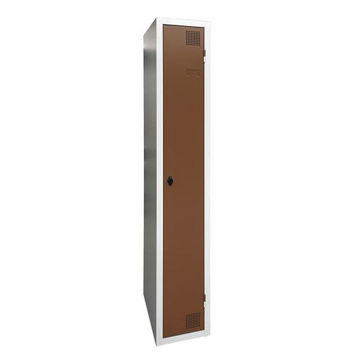 Vestiaire séchant à air chaud pulsé, de grande robustesse, avec case et penderie. Corps et porte en tôle électrozinguée, avec oméga de renfort sur toute la hauteur. Confortable d'utilisation avec un système de charnières offrant une ouverture à 180°. Hygiénique avec une double aération en façade, en partie haute et basse du vestiaire. Belle finition peinture époxy laquée, déclinée en une large palette de coloris attrayants. 2 fermetures au choix : serrure à clé ou moraillon porte-cadenas. Vestiaire avec porte étiquette. Produit fabriqué en France.