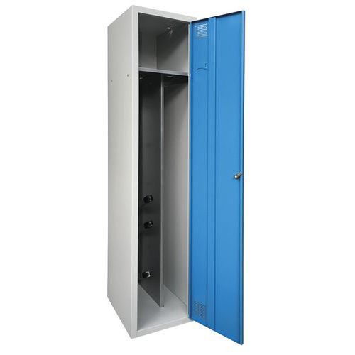 Vestiaire séchant à air chaud pulsé, très robuste, avec case et double penderie. Penderie double compartiment : rangement séparé des vêtements propres/salis. Corps et porte en tôle électrozinguée, avec oméga de renfort sur toute la hauteur. Confortable d'utilisation avec un système de charnières offrant une ouverture à 180°. Hygiénique avec une double aération en façade, en partie haute et basse du vestiaire. Belle finition peinture époxy laquée, déclinée en une large palette de coloris attrayants. 2 fermetures au choix : serrure à clé ou moraillon porte-cadenas. Vestiaire avec porte étiquette. Produit fabriqué en France.