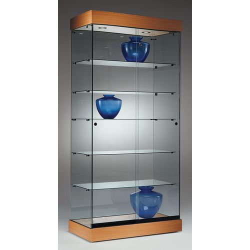 Vitrine entièrement en verre avec socle noir, blanc ou hêtre.