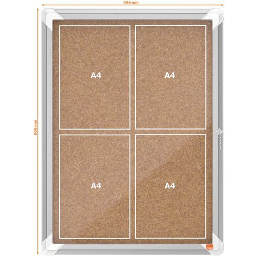 | Intitulé du produit | Vitrine d'intérieur Nobo à fond en liège 4 x A4, Capacité (nb de feuilles A4): 4, Porte matériau: Aluminium |