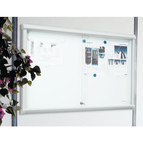 Vitrine d'affichage intérieur avec cadre en aluminium anodisé et portes coulissantes verrouillables via sa serrure à l'avant. Fond en tôle laquée permettant l’écriture effaçable à sec et l’affichage par plots magnétiques des documents. Porte en verre Securit transparent de 4 mm offrant une grande résistance aux impacts et aux chocs thermiques. L'avantage du verre Securit est que, en cas de bris, il se fragmente en petits morceaux afin d’éviter les accidents.