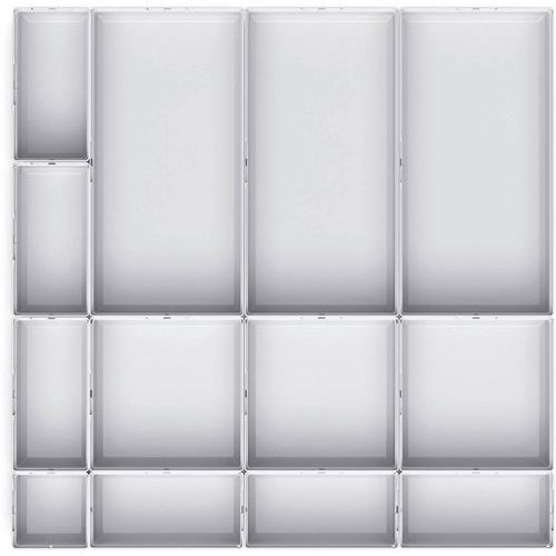 | Productnaam | Assortiment EKK-66100. 13 kleingoedbak, Breedte: 650 mm, Diepte: 650 mm, Hoogte: 100 mm, Kleur: Lichtgrijs |