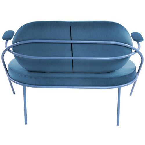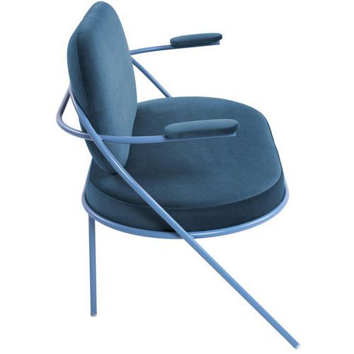 Modern ontwerp Langere levensduur: de zitting en rugleuning kunnen vervangen worden, de stof is niet verwijderbaar Stapelbaar Frame: buis Ø20 mm van 100% gerecycled staal met een epoxy-afwerking Zitting: multiplex paneel, dikte 12 mm Voering zitting: polyurethaanschuim 30 kg/m3, dikte 70 mm Voering rugleuning: polyurethaanschuim 30 kg/m3, dikte 60 mm Voering armleggers: polyurethaanschuim 30 kg/m3, dikte 15 mm